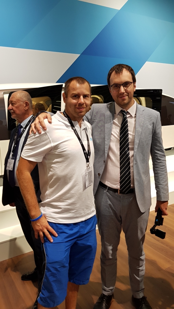 Podobne ako pred 2 rokmi, aj tentokrát bol stánok SkyWay vždy preplnený množstvom ľudí, a môžeme čestne a úprimne vyhlásiť, že za celý priebeh výstavy sme nikde nevideli žiaden stánok, kde by bolo zhromaždených viac ľudí, dokonca sa naplnenosťou iné stánky k tomu ani zďaleka nepriblížili. To znamená, že záujem o projekt SkyWay je obrovský a stále viac sa táto nová inovatívna doprava dostáva do povedomia ľudí, čo je samozrejme skvelé a prospešné. Najviac nás však oslovilo to, že väčšina účastníkov bola veľmi pozitívne naladená a hlavne, že tam boli ľudia z viacerých krajín z rôznych kontinentov – Aziati, Afričania, Austrálčania, samozrejme najviac Európania, ale aj ďalší. V tom bol tiež veľký rozdiel oproti minulosti, že na minulom Innotranse medzi účastníkov patrili väčšinou len ľudia z európskych krajín, teraz to zloženie záujemcov, podporovateľov a aj investorov bolo oveľa pestrejšie. Tú celosvetovú masívnu podporu projektu SkyWay bolo cítiť na každom kroku. O to viac bolo cennejšie, že to mohol prvý krát zažiť „na vlastnej koži“ aj tvorca a zakladateľ celej myšlienky pán Junický. Ľudia boli nadšení, že sa s ním mohli osobne stretnúť, pozdraviť, odfotiť, porozprávať, či popriať mu všetko dobré, a veľa síl a energie do ďalších rokov, aby úspešne dokončil celý projekt a pomohol výrazne zlepšiť dopravnú situáciu postupne na celom svete.